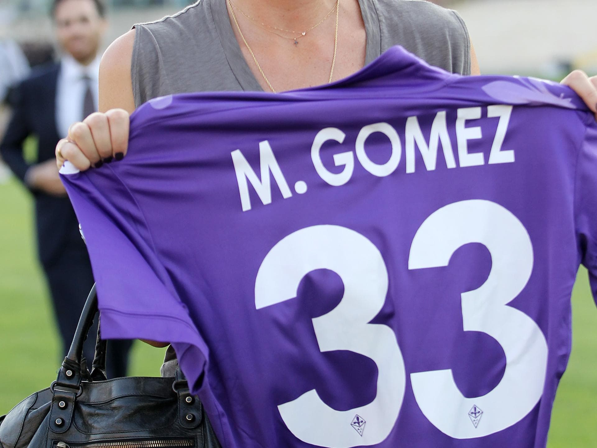 Dürfte wohl klar sein, wer hier das Florenz-Trikot von Mario Gomez in die Höhe hält: natürlich seine bessere Hälfte.