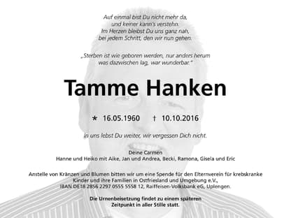 Anstelle von Blumen bitten die Hinterbliebenen um Spenden für den Elternverein für krebskranke Kinder und ihre Familien in Ostfriesland und Umgebung. Eine Urnenbeisetzung "in aller Stille" wird für einen späteren Zeitpunkt angekündigt.