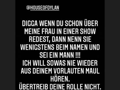 Digga, wenn du schon über meine Frau in einer Show redest, dann nenn sie wenigstens beim Namen und sei ein Mann! Ich will sowas nie wieder aus deinem vorlauten Maul hören. Übertreib deine Rolle nicht.